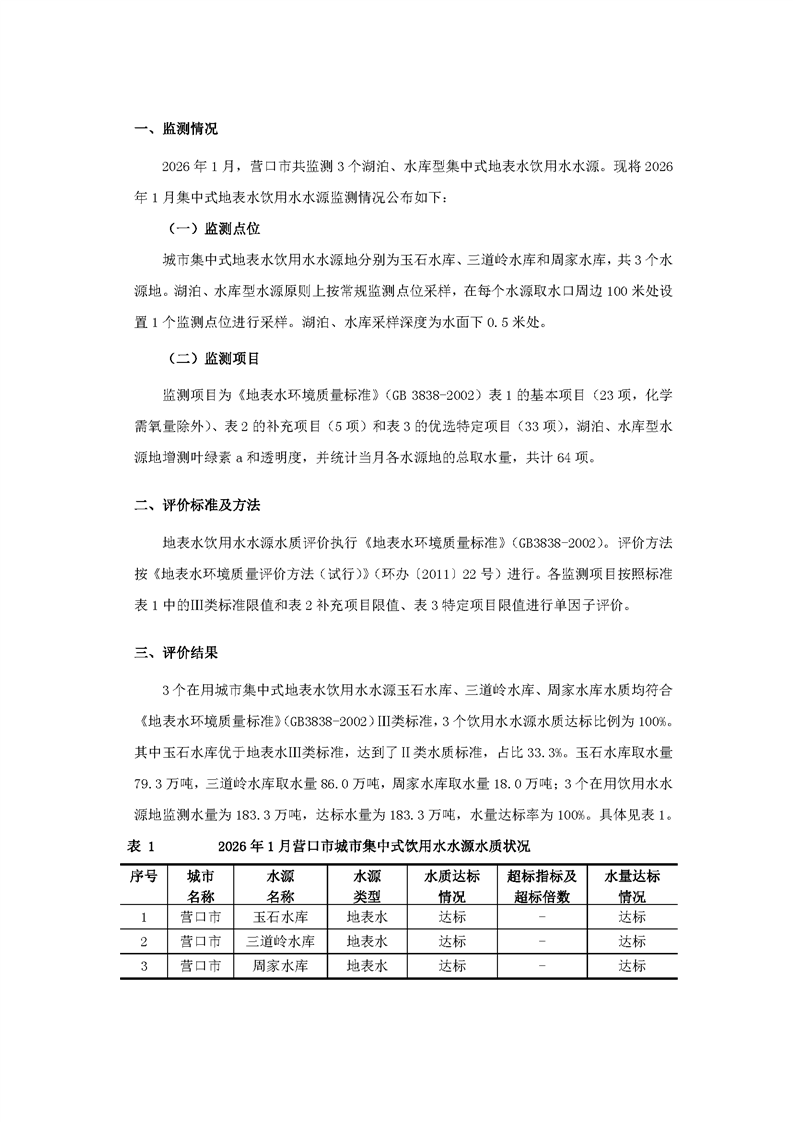 营口市2026年1月城市集中式饮用水水源水质状况