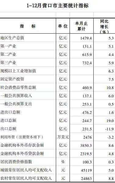 2023年1-12月营口市主要统计指标