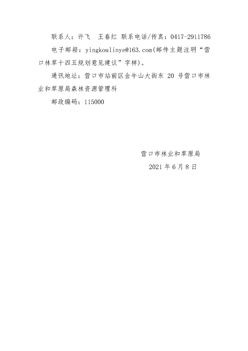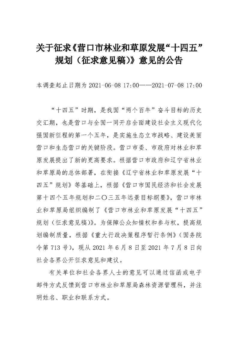 关于征求《营口市林业和草原发展“十四五”规划(征求意见稿)》意见的公告