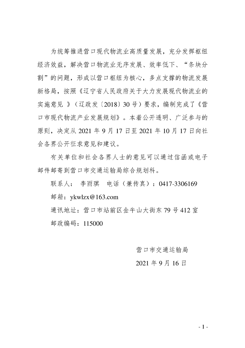 关于征求《营口市现代物流产业发展规划》意见的公告