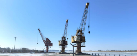 塔吊共4台,占地面积约155平方米,为港口专用工业起重构筑物,整体保存完好、作业功能稳定,当前作为辽河老港集市的组成部分,实现了工业遗产的活态活化利用。其核心承担码头件杂货、集装箱及散货的装卸作业,与2#、3#、4#码头塔吊形成功能互补、覆盖全港区的起重作业体系。该组塔吊系统性优化了码头货物周转全流程,有效保障了港区全岸线作业的连续性,助力港口综合服务能力的全面提升,是营口港装卸作业体系完善的重要实物标志。