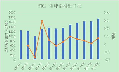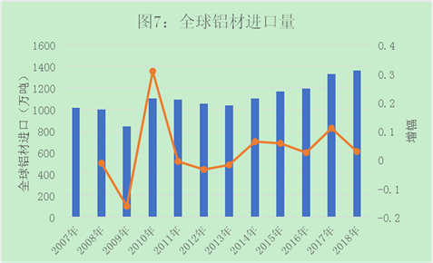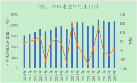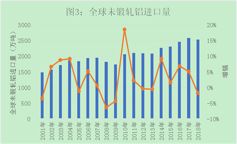 2018年,全球未锻轧铝(包括非合金铝和铝合金)进口量为2523万吨,是全球电解铝产量的39.2%。