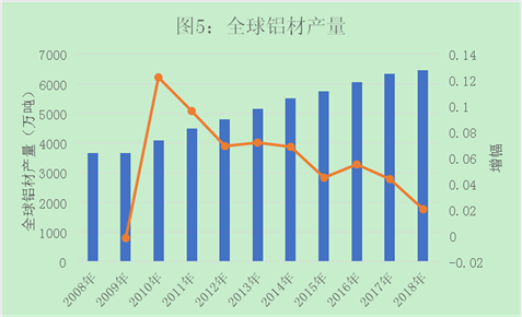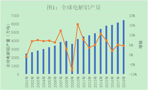 2018年,全球电解铝产量为6434万吨,比上年增长4.5%,2013-2018年年均增长率为5.8%。