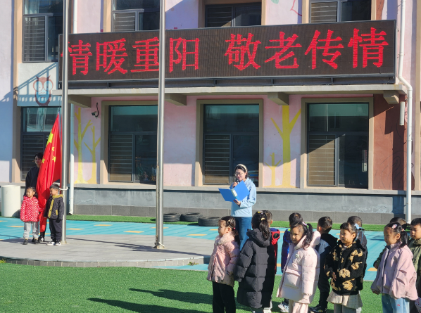 伴随着庄严的国歌,五星红旗冉冉升起,大三班幼儿用歌声和舞蹈表达了对长辈的感恩之心。